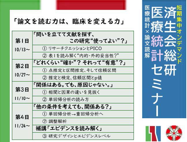 こうした問題意識のもと、本年度に、済生会総研では全4日を想定したオンデマンド形式による統計セミナーを企画しました。本セミナーは統計学を網羅的に教えるものではありませんでした。